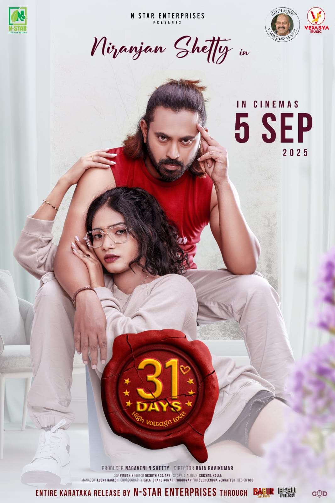 Nstar ಬ್ಯಾನರ್ ನಲ್ಲಿ ನಾಗವೇಣಿ. N. ಶೆಟ್ಟಿ ಅವರು ನಿರ್ಮಿಸಿರುವ “31DAYS” ಚಿತ್ರವನ್ನು ರಾಜ ರವಿಕುಮಾರ್ ನಿರ್ದೇಶಿಸಿದ್ದಾರೆ. ನಿರಂಜನ್ ಶೆಟ್ಟಿ ಅವರಿಗೆ ನಾಯಕಿಯಾಗಿ ಪ್ರಜ್ವಲಿ ಸುವರ್ಣ ನಟಿಸಿದ್ದಾರೆ.