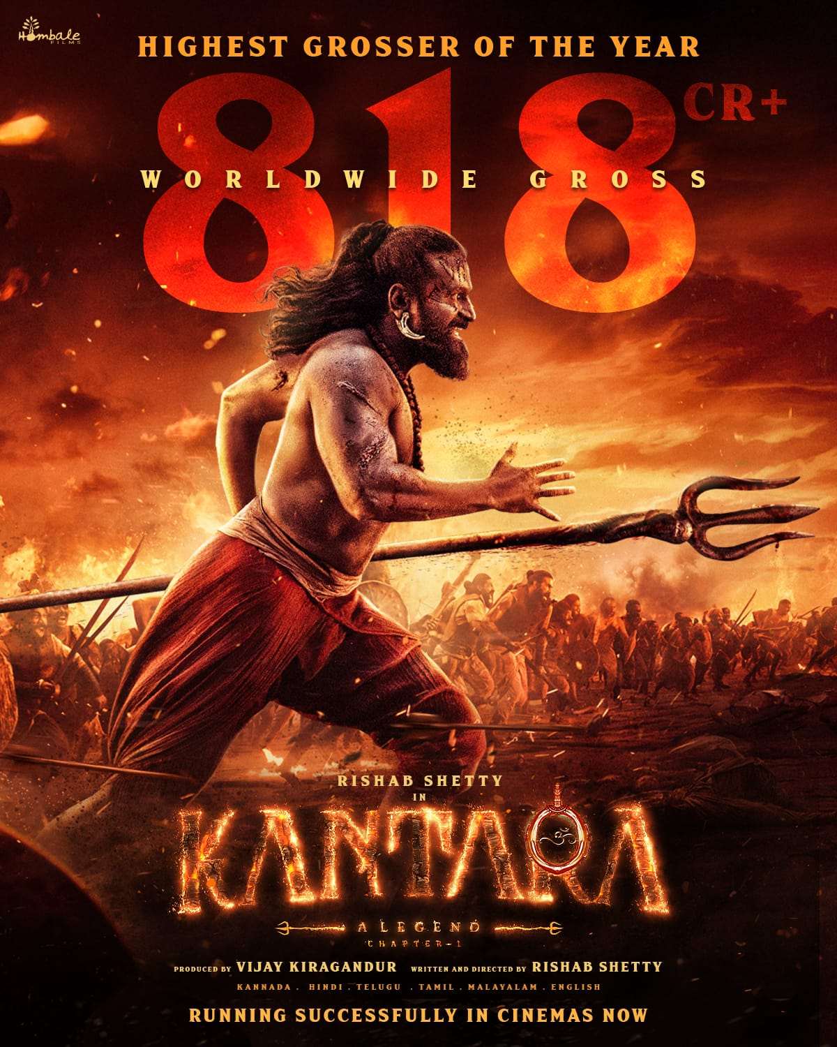 ಕನ್ನಡದ ಹೆಮ್ಮೆಯ ಚಿತ್ರ ನಿರ್ಮಾಣ ಸಂಸ್ಥೆ ಹೊಂಬಾಳೆ ಫಿಲಮ್ಸ್ ನಿರ್ಮಾಣದ ಡಿವೈನ್ ಸ್ಟಾರ್ ರಿಷಬ್ ಶೆಟ್ಟಿ ನಿರ್ದೇಶನದ ಹಾಗೂ ಅಭಿನಯದ ಕಾಂತಾರ ಅಧ್ಯಾಯ 1 ವಿಶ್ವದಾದ್ಯಂತ ಬಾರಿ ಪ್ರಶಂಸೆಯನ್ನು ಪಡೆದು, ಗಳಿಕೆಯಲ್ಲಿ 818 ಕೋಟಿಗಳನ್ನು ಗಳಿಸಿ ಮುನ್ನುಗ್ಗುತ್ತಿದೆ. ಇದು ಕನ್ನಡ ಸಿನಿಮಾ ವಿಶ್ವದಾದ್ಯಂತ ಹೆಸರು ಪಡೆದು, ಕನ್ನಡ ಚಿತ್ರರಂಗದ ಕೀರ್ತಿಯನ್ನು ಹೆಚ್ಚಿಸಿರುವುದು ಹೆಮ್ಮೆಯ ವಿಷಯ ಎನ್ನಬಹುದು.