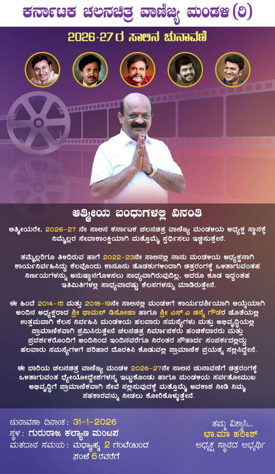 2026-27 ಸಾಲಿನ ಕರ್ನಾಟಕ ಚಲನಚಿತ್ರ ವಾಣಿಜ್ಯ ಮಂಡಳಿಯ ಚುನಾವಣೆಯ ಸ್ಪರ್ಧೆಯಲ್ಲಿ ಮತ್ತೊಮ್ಮೆ ಬಾ.ಮಾ. ಹರೀಶ್.